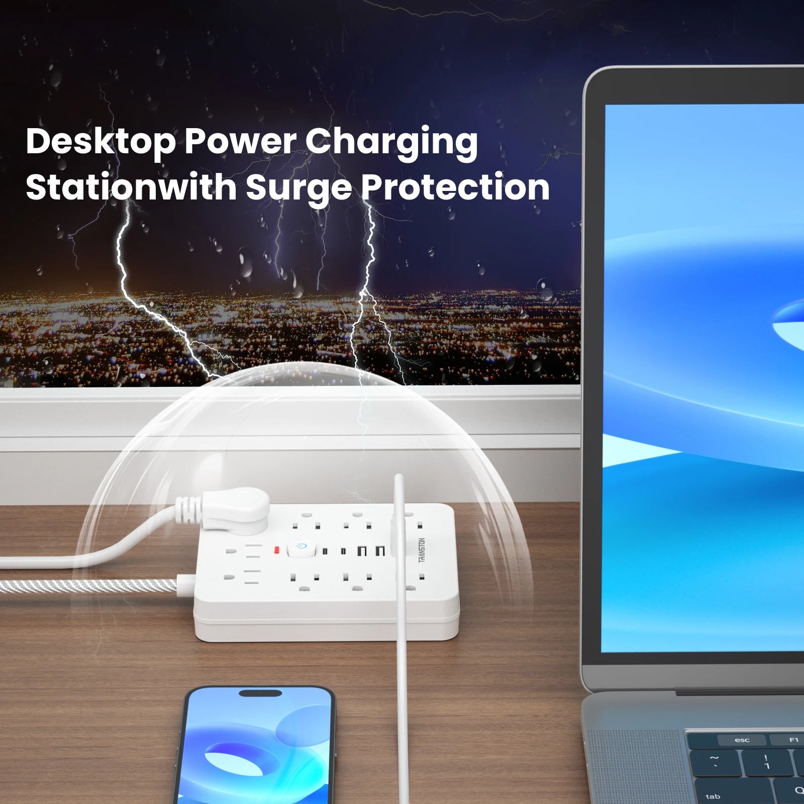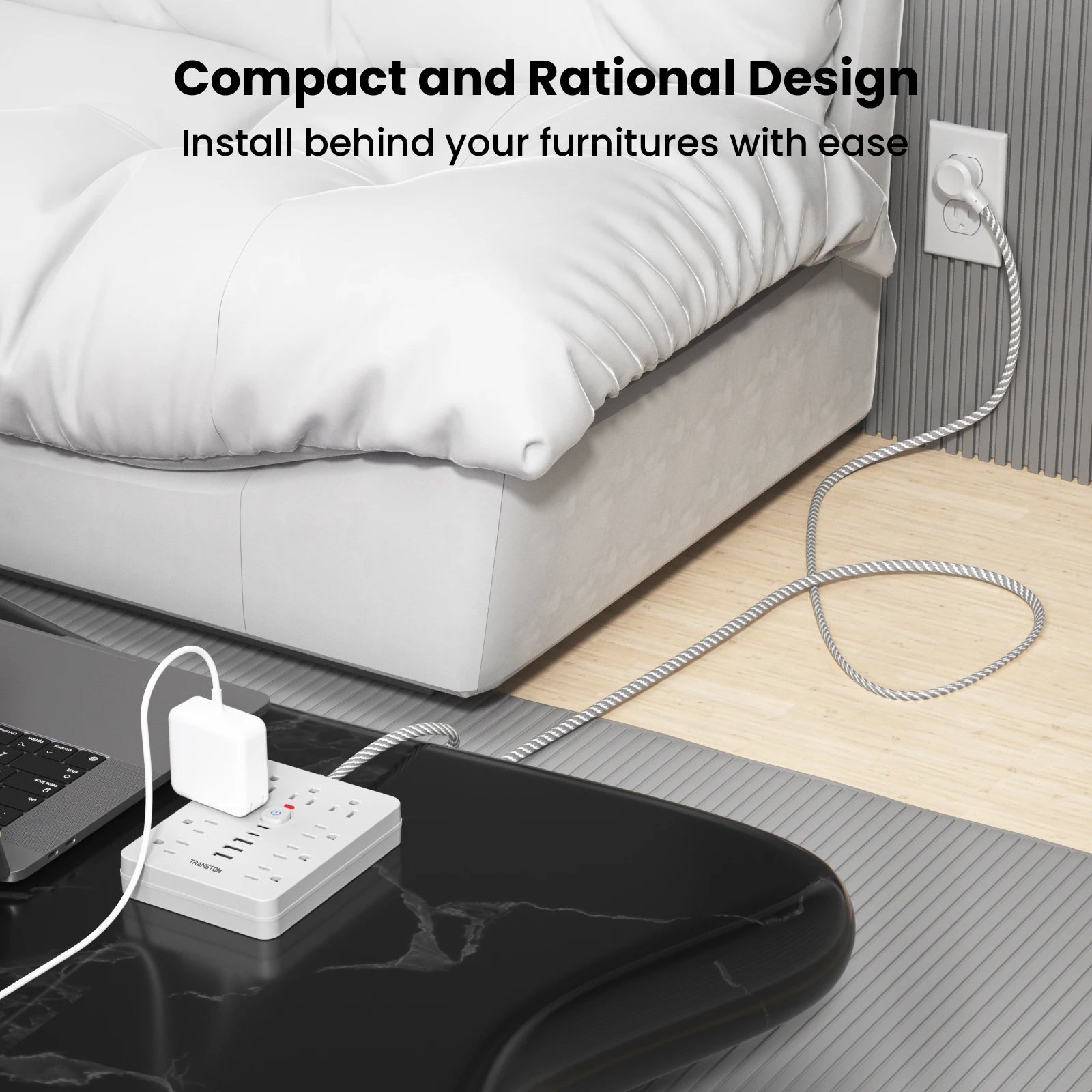TRANSTON power strip surge protector with 9 Ac Outlets,3 USB & 2 USB-C,5ft Cable,45° tilt plug,white